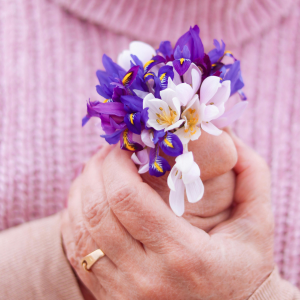 Person holding a small bouquet of purple, white, and yellow flowers with a pink sweater in the background.